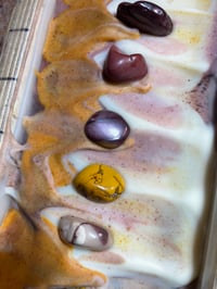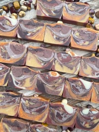 Ingredients: Coconut oil, olive oil, water, sodium hydroxide, rice bran oil, organic virgin fair trade Shea butter, avocado oil, essential oil: bergamot, Ginger, geranium, lavender, black pepper, safflower powder, sandalwood powder, kaolin clay, turmeric powder, alkanet root powder, Madder root powder, yellowdock root powder, Brazilian purple & yellow clay, Mookite jasper