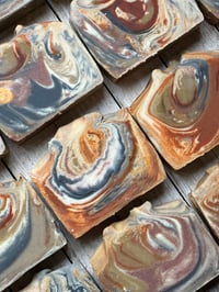 Ingredients: coconut oil, water, olive oil, *argon oil, sodium hydroxide (no longer present in soap), sesame oil, *virgin fair trade Shea butter, rice bran oil, essential oil blend: (ginger, cedar, geranium) *Rosehip powder, neem powder, *turmeric powder, *chaste tree berry powder, activated charcoal powder, (*organic)
