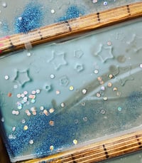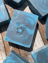 This cosmic soap is a fun blend of two different scents. Half the batch scented with patchouli essential oil and half the batch scented with vanilla black raspberry fragrance oil. It's topped with biodegradable glitter and fun little star stamps!!